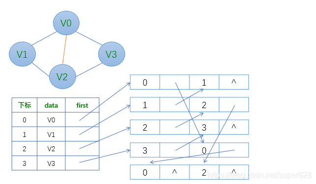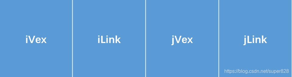 其中iVex和jVex是与某条边依附的两个顶点在顶点表中的下标。iLink指向依附顶点iVex的下一条边,jLink指向依附顶点jVex的下一条边。