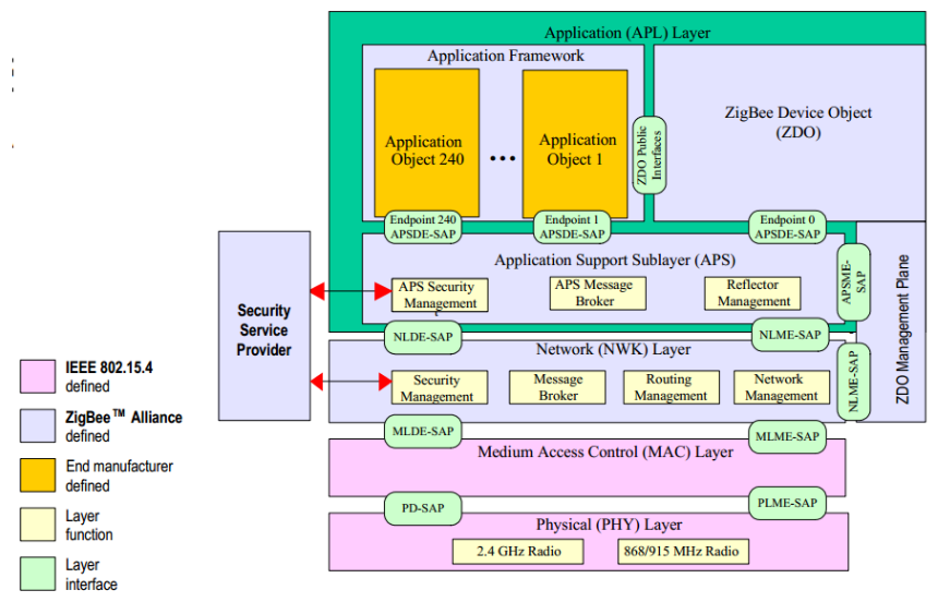 ZigBee 协议栈底层基于 IEEE 802.15.4 协议,上层由 ZigBee 联盟定义网络层、应用层和安全服务层。