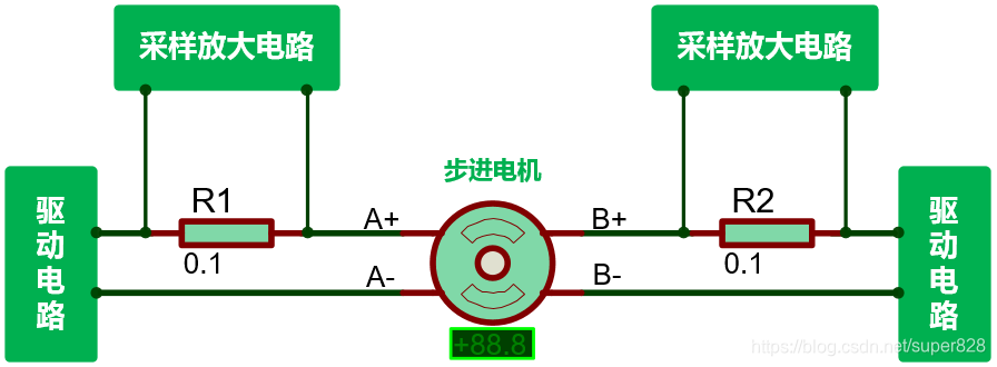 有一个两相四线的步进电机,需测量其A、B两相的电流大小,电机线圈的电阻为0.6Ω,电感为2.2mH。打算在A、B相各串接一个0.1Ω的采样电阻,然后通过放大电路,送到单片机采样(STM32,12位AD采样),放大的电压值是最大应为3v。电路如下。我在这里讨论其中的采样放大电路。很多东西平时在书本上学到烂熟,但真正在实战时,还是碰到了不少问题。纸上得来终觉浅,绝知此事要躬行。因此,在这里总结一下,供自己学习之用,或许也可给大家一点点帮助。