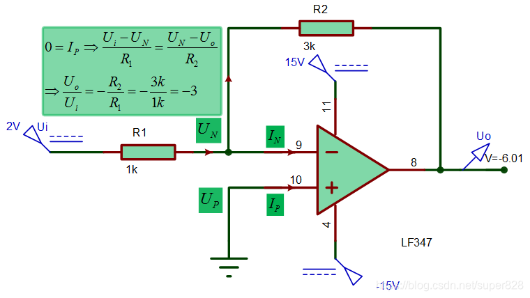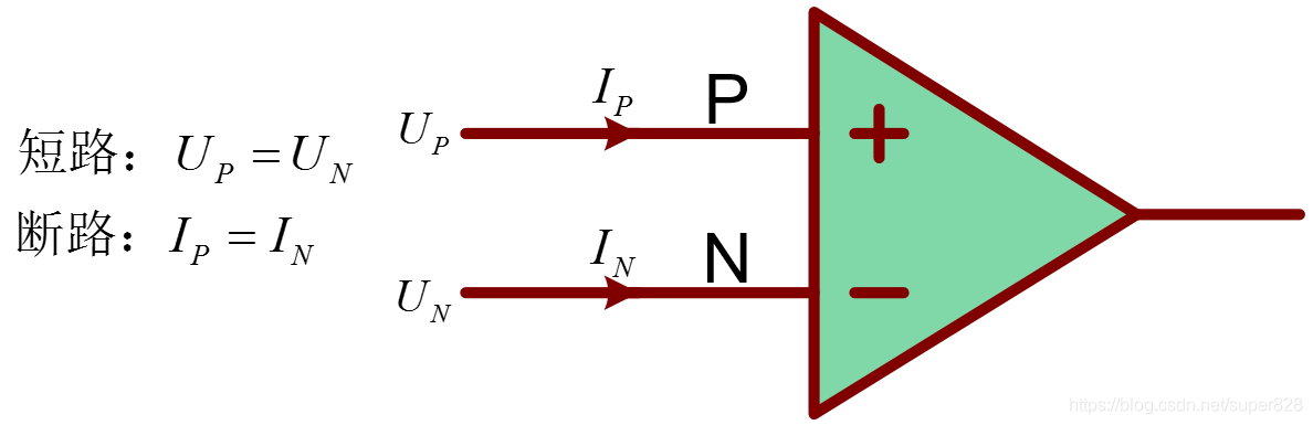 这里暂时不讨论放大电路的工作原理,直接使用放大器的虚短(短路)和虚断(断路)性质来分析这一类电路,之所以在前面加个虚字,是因为放大器的两端并不是真正的短路或断路。如下图所示,虚短:UP=UN,虚断:IP=0; IN=0。无论放大器接在何种电路中,这两个式子都是成立的。