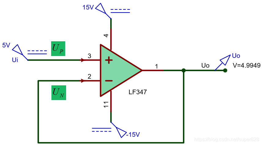电压跟随,听名字应该就能想到,它的作用就是输出电压Uo应该是随着输入电压Ui变化而变化的(Uo=Ui),如下图所示,由上面讲到的虚短性质,很容易得到Ui=Up=Un=Uo。有人会疑问,直接把Ui接到Uo,岂不是更加方便,要这个做什么。这个就要看电路需求而定了。电压跟随器的作用一般是起到隔离的作用,输入的电流太大的话,也不影响到输出的电流。