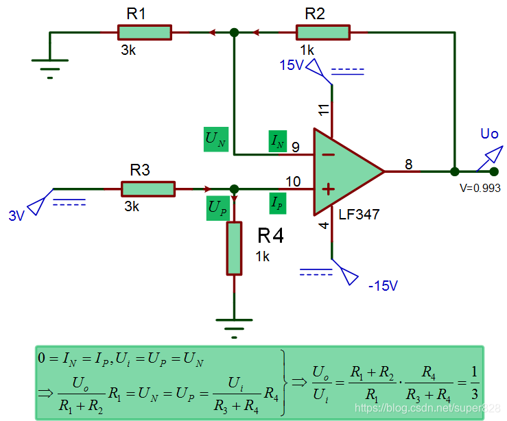 在使用差分放大电路时,有一点需要特别地注意,不仅|k*(U1-U2)|<15(最好是小于13V左右,取得比较好的效果),而且Un与Up应该也要小于15v,否则放大不会工作在线性区,导致电路非正常工作。