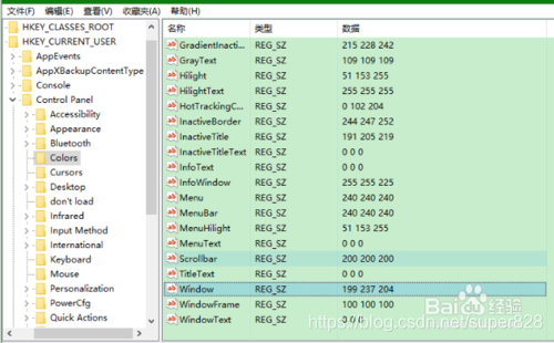 2.根据路径找到:HKEY_CURRENT_USER->Control Panel->Colors ,找到“window”