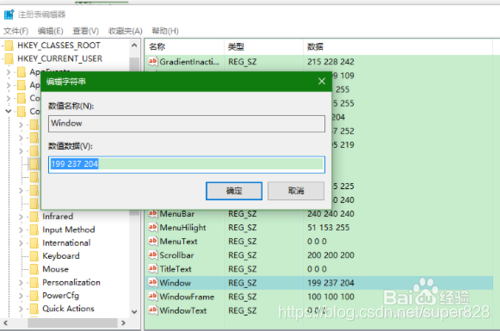 3 双击弹出窗口,将其值改为199,237,204(此为豆沙绿),重启机即完成。...