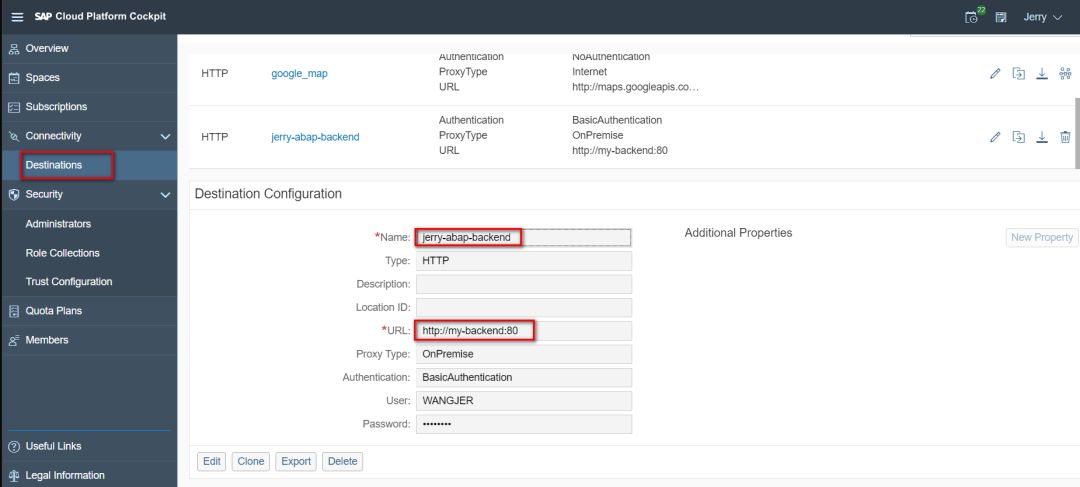 首先在SAP云平台Cockpit里创建一个新的Destination,URL字段指向前一步Cloud Connector里创建的Virtual Host。这个Destination的名称也得记录下来,后面会用到。
