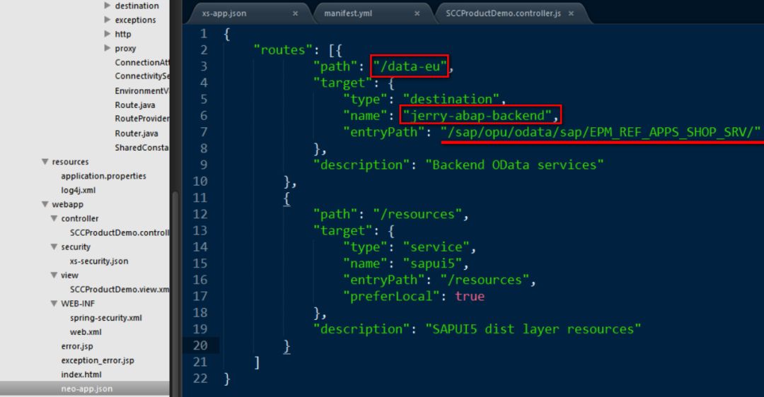 针对这个相对路径data-eu,在neo-app.json里定义了一个路由,会被重定向到On-Premise系统的标准OData服务EPM_REF_APPS_SHOP_SRV。具体重定向到哪个On-Premise系统是由路由的target字段决定的。在我这个例子里是jerry-abap-backend, 它就是我们之前在SAP云平台Cockpit里创建的Destination。