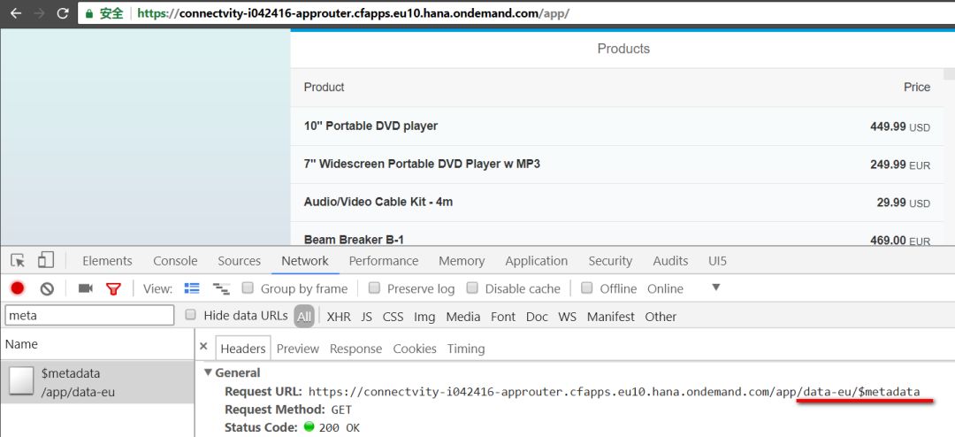 并且Chrome开发者工具里观察到的网络请求的路径里仅仅包含前文提到的UI5应用的neo-app.json里配置的路由data-eu, 而On-Premise系统的主机名和端口号并未暴露到Cloud环境中。