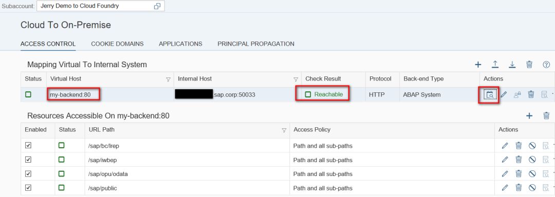 创建一个从Virtual Host到Internal Host的映射关系。Virtual Host的名称可以随便维护,我维护的是my-backend, 记住这个名称,以后会用到。Internal Host我维护的是提供OData服务的On-Premise系统的主机名和端口号。点击Check按钮,确保Cloud Connector能够成功连接On-Premise系统,状态为Reachable。