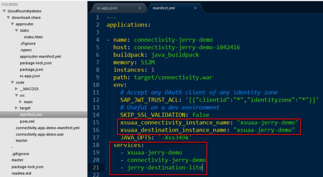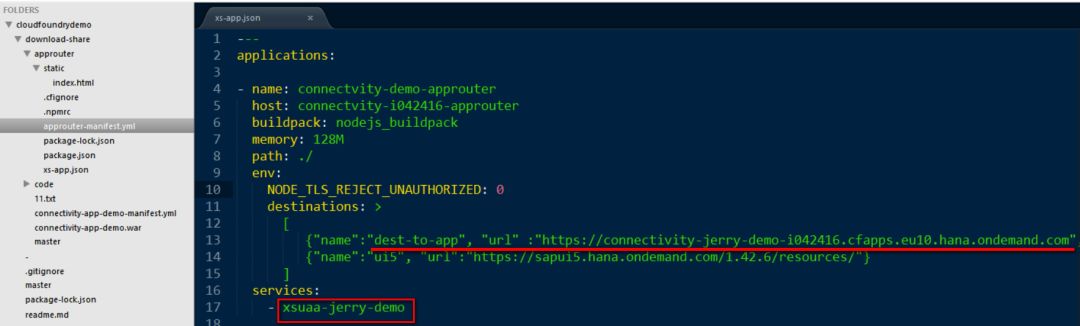 而这个destination对应的真实url维护在App Router的manifest.yml文件中。同样需要在该yml文件的services字段里维护前一步创建的XSUAA实例: