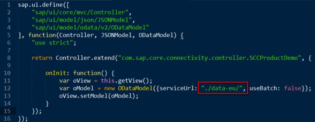 接下来我们需要进行Web应用里UI5部分的开发,指定产品列表的数据源基于哪一个OData服务。在UI5的controller文件里,指定OData模型的路径为相对路径data-eu。