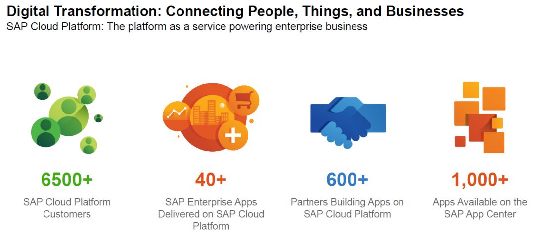 截至2017年,全球已经有超过6500个客户使用SAP云平台,有600家Partners在SAP应用中心上发布了超过1000个基于SAP云平台的应用。