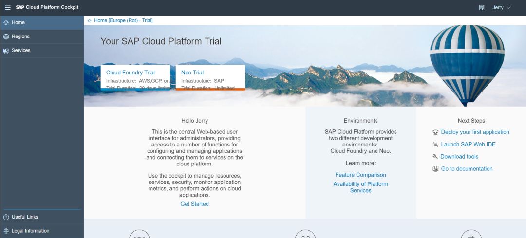 在Jerry注册的测试帐号所在的地域里,有多达70个服务可用。开发人员可以通过Java,JavaScript,Python等多种编程语言,在本地开发应用之后部署到SAP云平台。这些应用既可以消费SAP云平台上提供的标准服务,也能通过SAP云平台同客户的On-Premise系统进行交互。