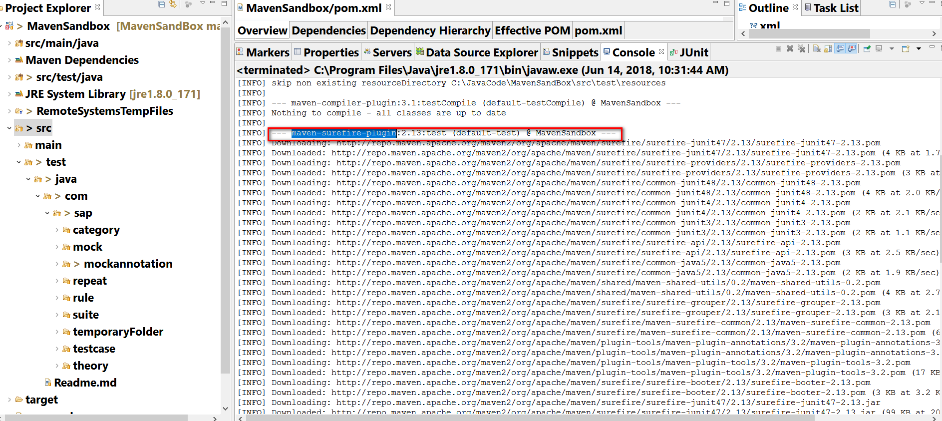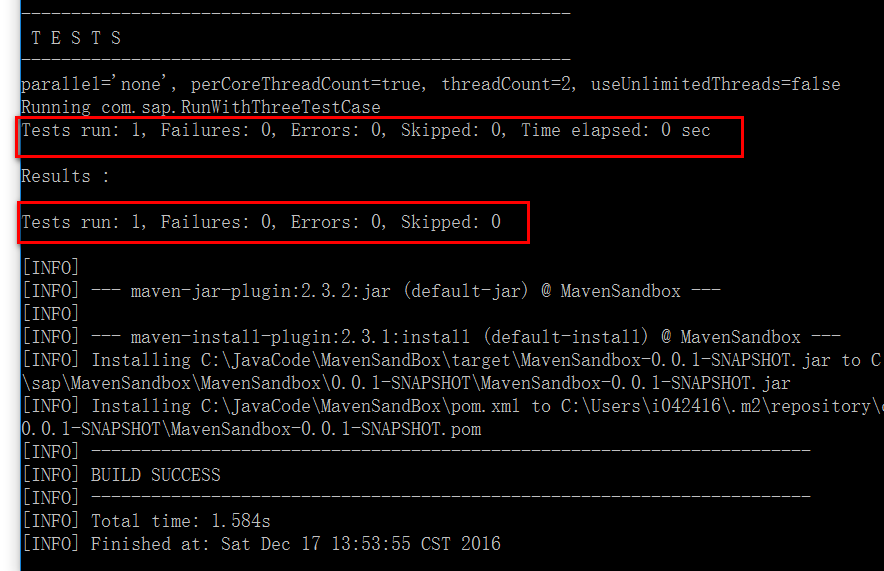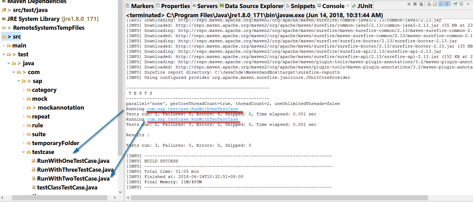 下图表明在执行mvn clean install时,执行了srv/test/java/com/sap/testcase下面的两个test case: