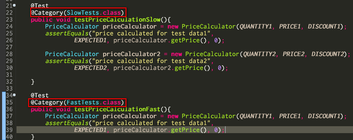Java里单元测试的灵活之处在于可以给同一class里的不同方法指定不同的Category: