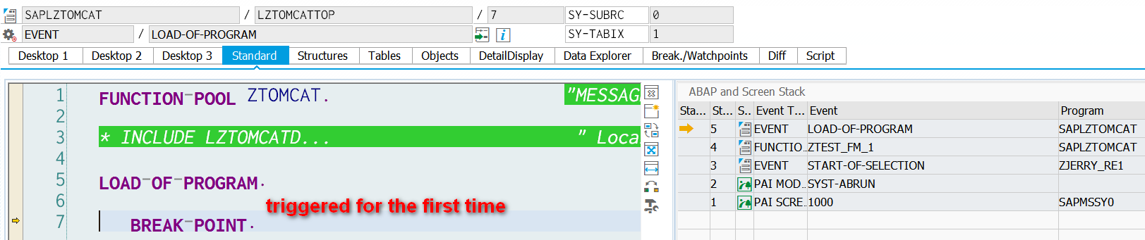 现在我有一个名为ZTOMCAT的function group。其LOAD-OF-PROGRAM就负责弹出调试器。