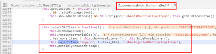 那min_position和max_position呢?我们回到刚才定义请求的位置继续向上追溯,找到了getOldItems的方法。当用户在时间轴上向下滚动鼠标到最后时,就会调用到这个方法,而在其中会把上一次响应当中的min_position赋值给这一次请求当中的max_postion。