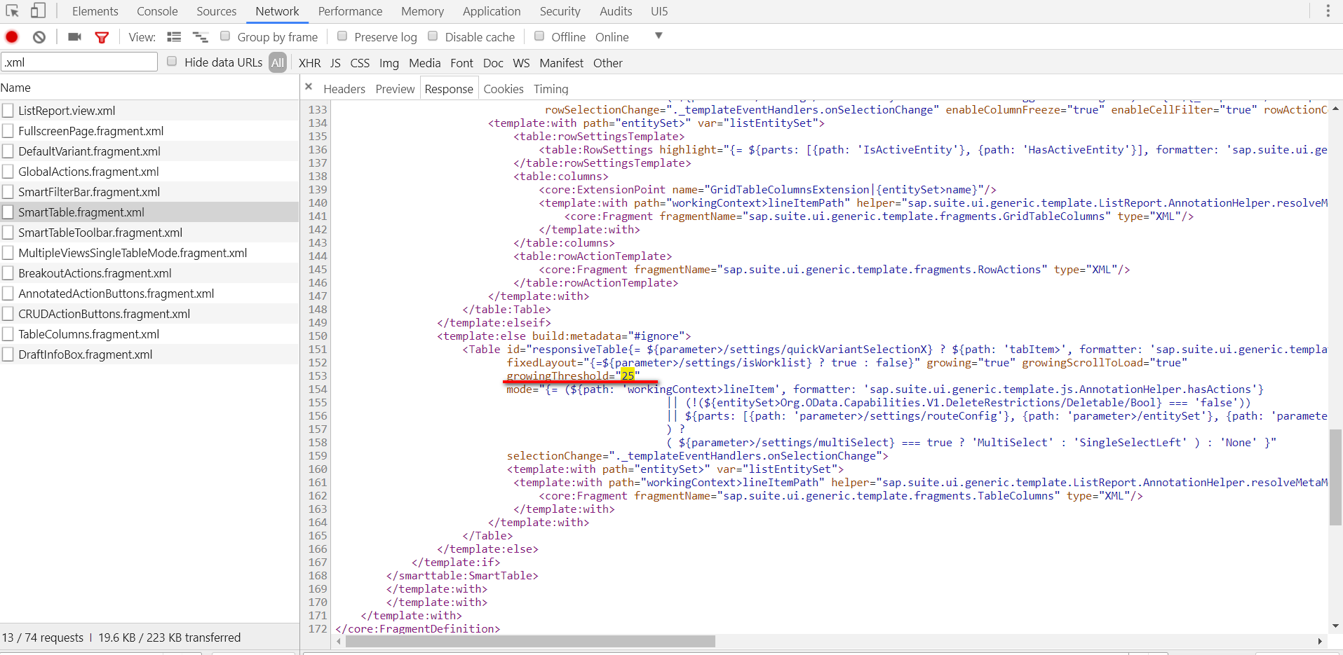 由于篇幅限制,Jerry直接揭晓答案了。S/4HANA里的Fiori应用都是使用Smart Template技术实现的,其列表区域的实现位于SmartTable.fragment.xml这个模板文件里,growingThreshold指定为25。因为从时间序列上来说SmartTable.fragment.xml后于sap.m.ListBase.js加载,所以对于分页尺寸的定义其优先级更高。