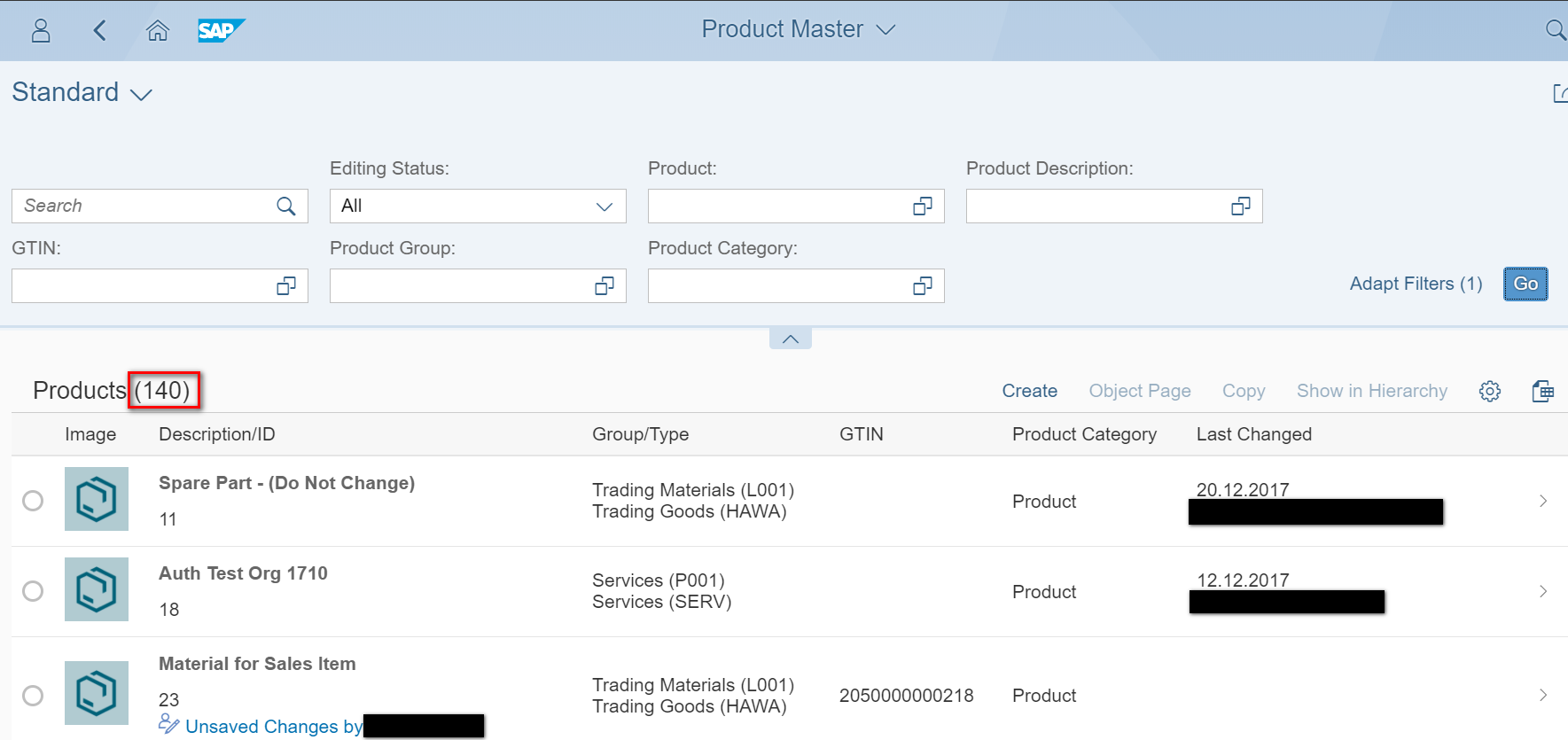 以S/4HANA Product Master Fiori应用为例,如果什么搜索条件都不指定,默认会返回25条数据,并且在UI上显示该系统总的product数量,在Jerry使用的系统里总共存在140个product。