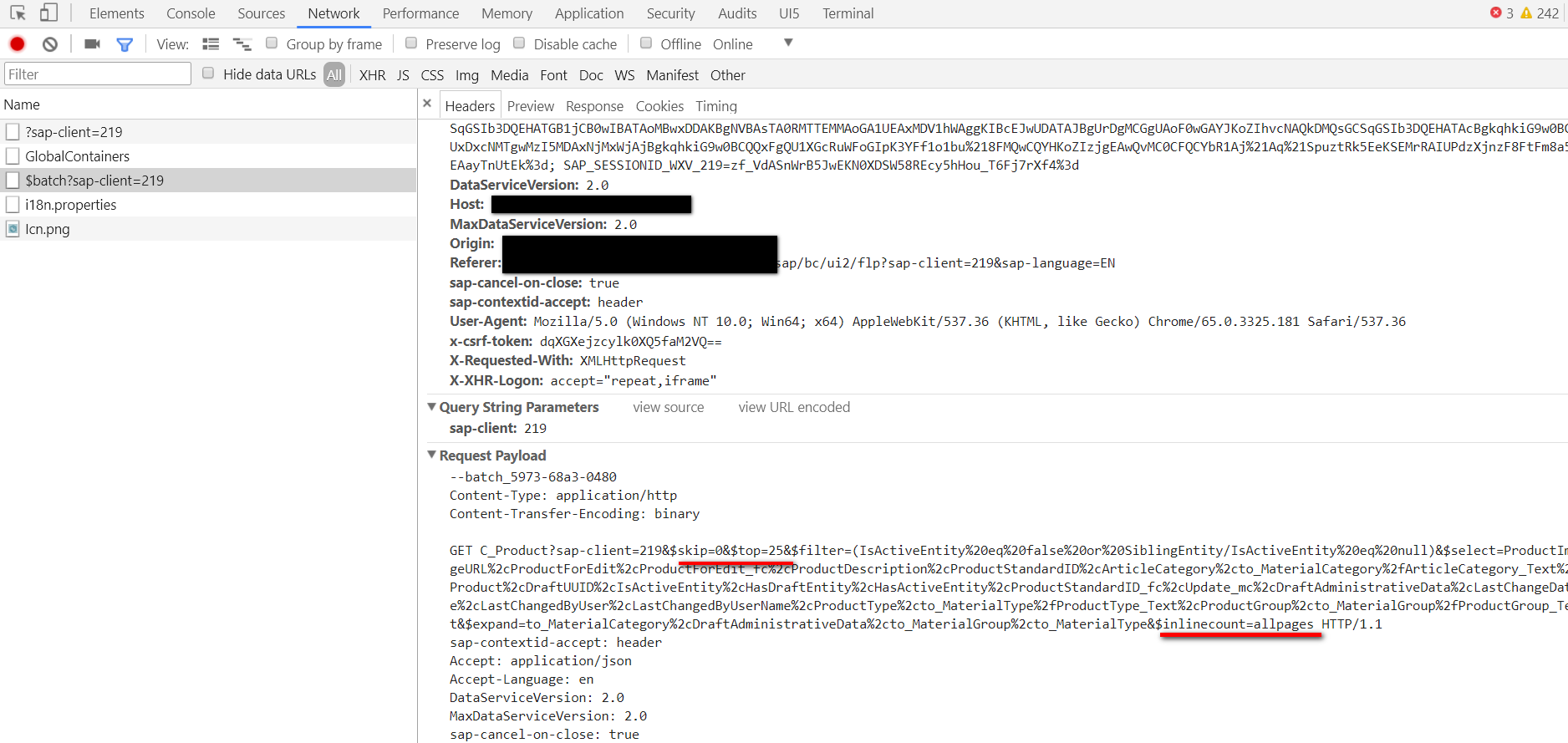 该搜索分页的实现归功于OData请求的参数,skip=0&top=25,意为从请求命中的第0条记录开始, 总共返回25条记录。而另一个参数inlinecount,其工作原理可以类比ABAP Open SQL的关键字SELECT COUNT(*),用于统计数据库表的条目数。