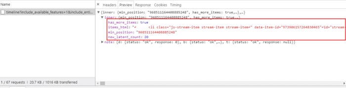 - items_html:格式化之后发现,这个部分就是我们所请求到的推文内容。显然Twitter使用到的是后端渲染的技术,将推文内容渲染好直接发给前端进行展示。