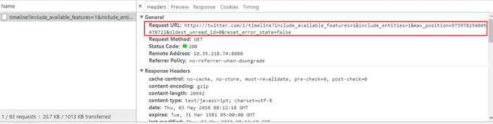 首先我们在开发者工具的Network工具中截取一条当用户滚动加载时发出的请求。结果发现它长下面这个样子。