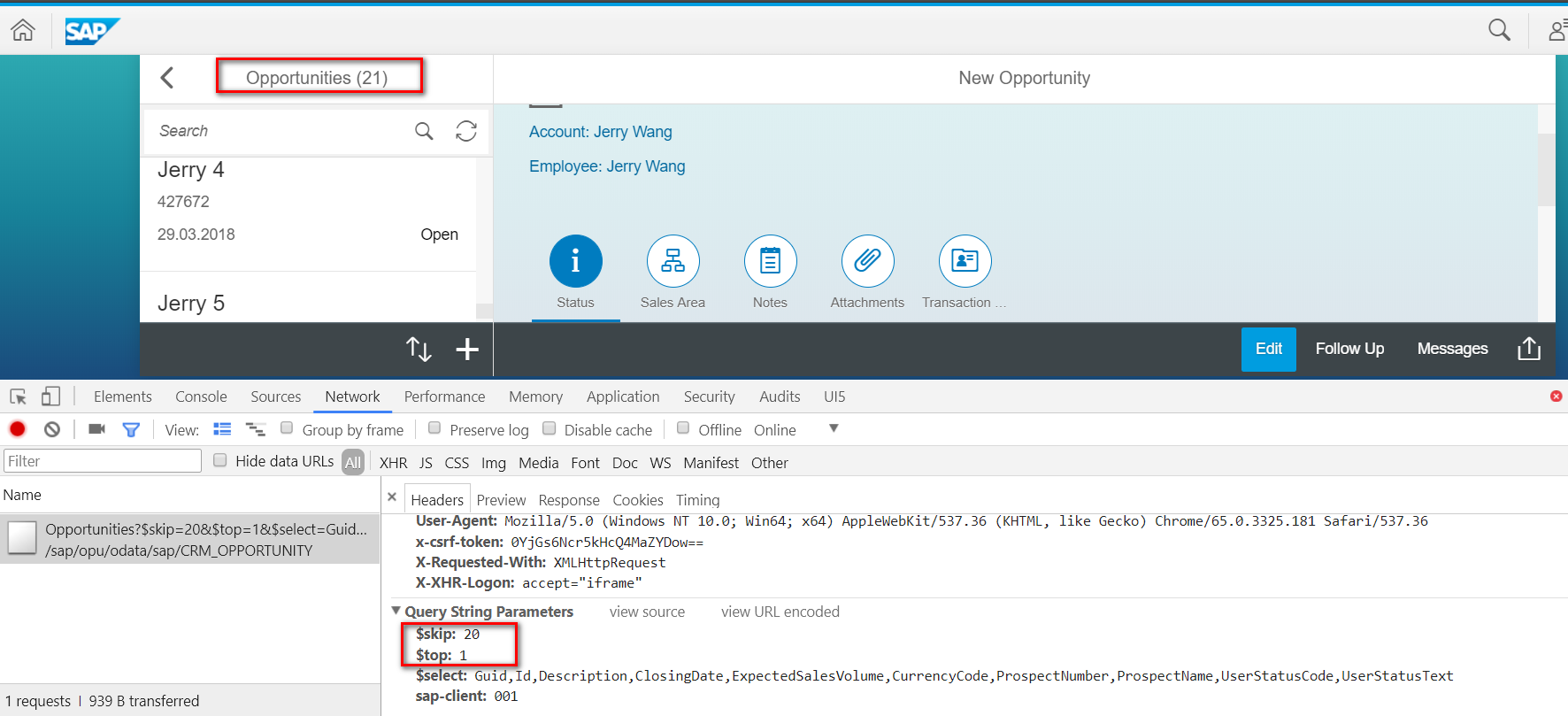 CRM Fiori应用的前台搜索分页实现原理和S/4HANA Fiori应用类似,只是分页尺寸变成了20。