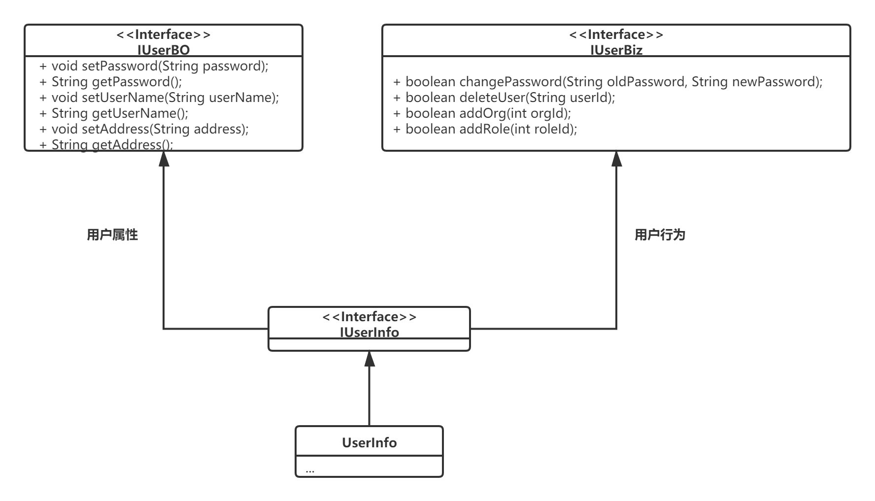 我们将IUserInfo接口抽象为两个接口,分别是用户属性相关接口IUserBO,行为相关接口IUserBiz,修改后的代码如下所示: