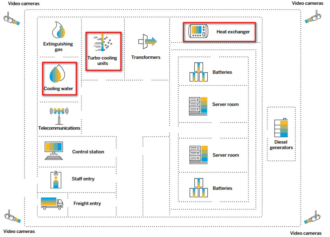 再回到位于德国St.Leon-Rot的SAP数据中心的布局和组件构成示意图,下图的三个组件都和散热有关: