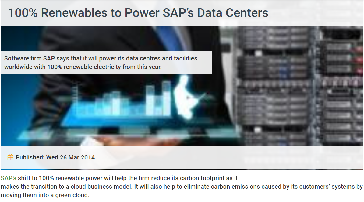 早在2014年,SAP就宣布其数据中心使用的能源为100%可再生资源。