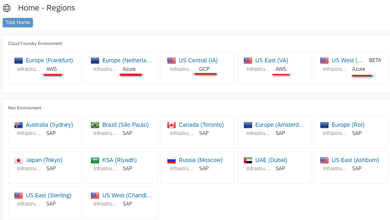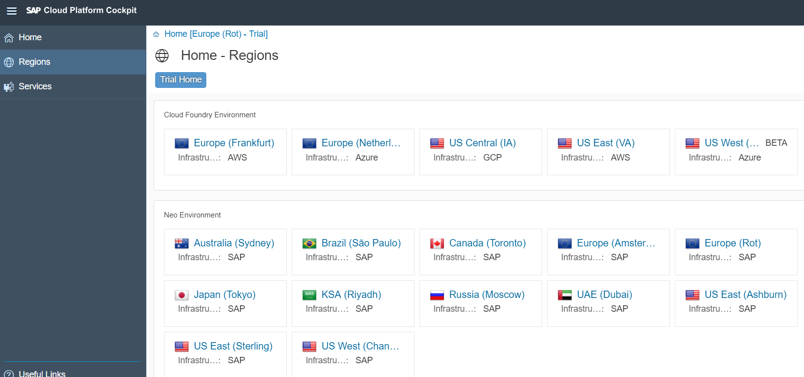 再回到SAP云平台的Cockpit。Region标签页里每个Region代表地球上的一个数据中心。