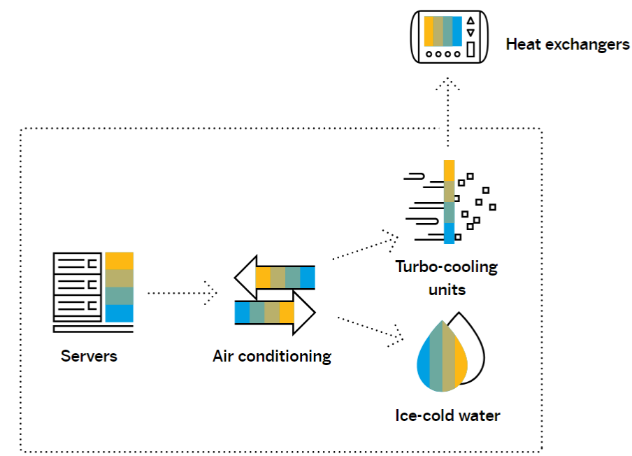 当外界温度低于12~13摄氏度时,机房内的空调装置将机房内充满服务器工作时产生巨大热量的热空气抽除至室外,以室外的冷空气替代。当室外温度高于13摄氏度时,空调系统会使用水冷方式进行散热(和上世纪末90年代末本世纪初电脑发烧友使用水冷装置辅助散发CPU超频时产生的大量热量方法一致)。Rot数据中心共有6个turbo-cooling单元,它们只有部分处于运行状态,其他则处于备用和候补只用。一旦数据中心处于运行中的冷却系统出现故障,在备用单元启动之前,数据中心将使用预留的30万升4摄氏度以下的冰水,确保备用冷却单元启用前数据中心的散热需求。