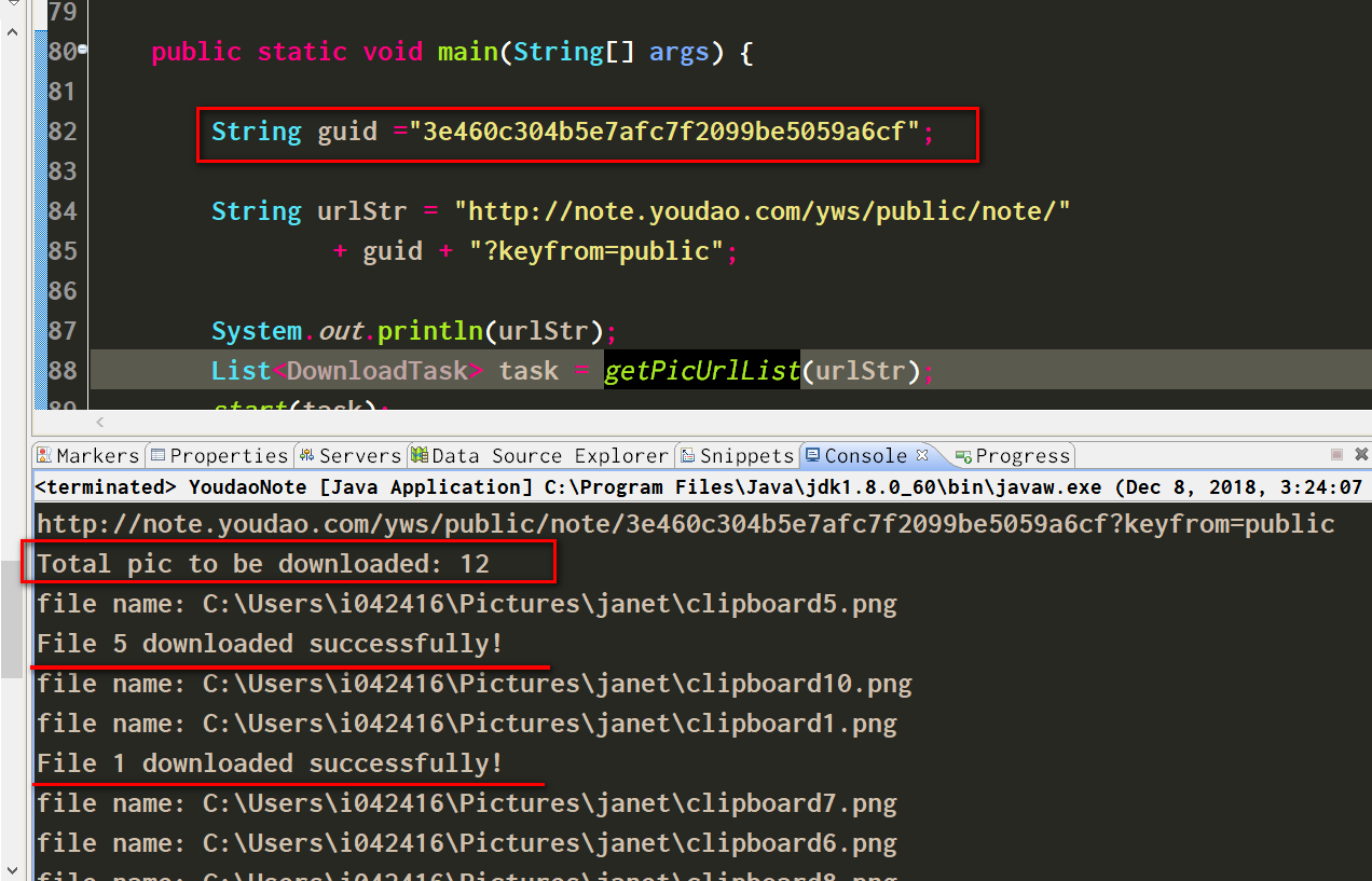 把拷贝的值放到第82行main行数的guid变量里,直接执行,可以看到输出,首先我的代码会判断这个笔记包含了多少张图片,然后会以多线程的方式去并行下载图片。