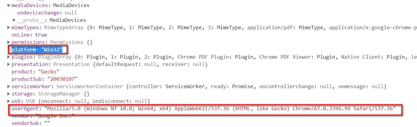 其中有个字段platform: 我如果在安装了Windows系统的电脑上使用Chrome,该值为Win32。
