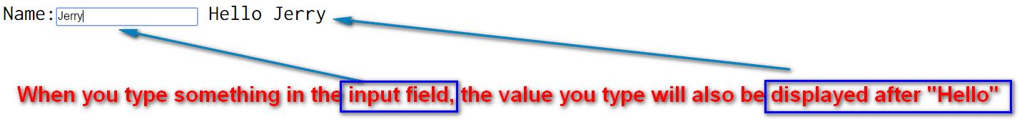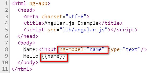 在浏览器里打开它,在Input field里输入一些内容后,这些内容会存储在通过指令ng-model声明的名称为name的模型里。在HTML的正文,通过语法"{{name}}"将模型name存储的内容显示在浏览器上。
