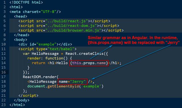 和动态的{this.props.name}组成。在渲染的时候,{this.props.name}会被替换成Jerry。最后看到的HTML上会显示Hello Jerry。
