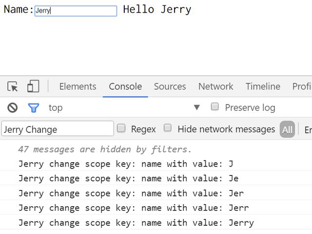 还是上面的例子,如果我输入单词Jerry,在Chrome开发者工具里会观察到下列的日志:
