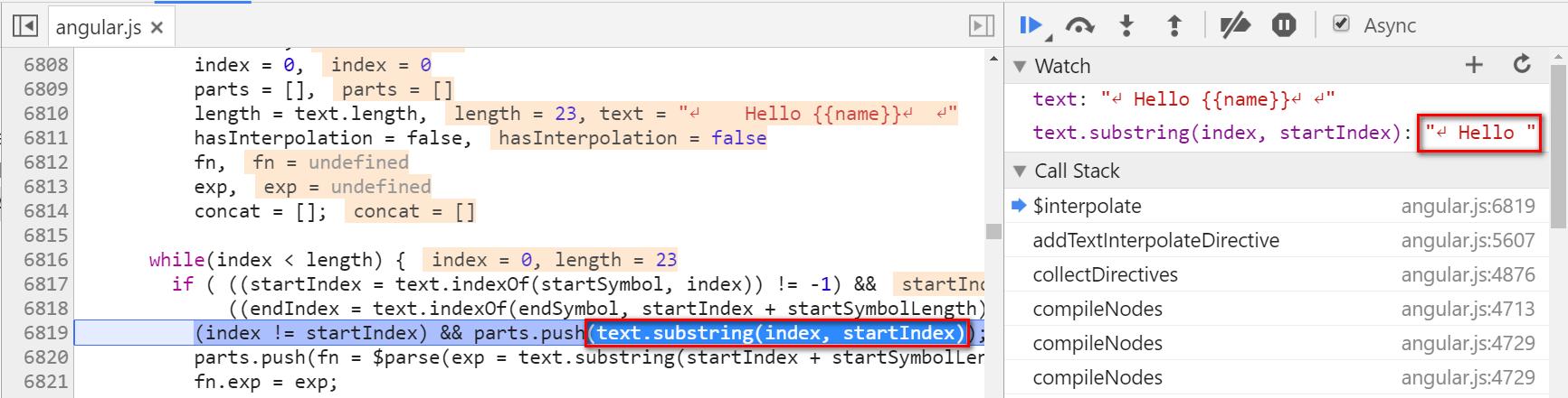 其实也没有什么高深之处,Angular首先还是会用JavaScript字符串自带的API indexOf去查找字符串内是否包含了startSymbol即{{, endSymbol即}}。