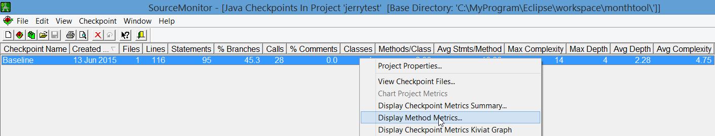 很快Source Monitor就将我们指定的Java文件的环复杂度计算完毕。点击菜单“Display Method Metrics”来查看结果: