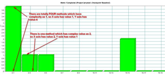 X轴的值代表每个方法的环复杂度,Y轴代表这些环复杂度的不同值出现的次数。