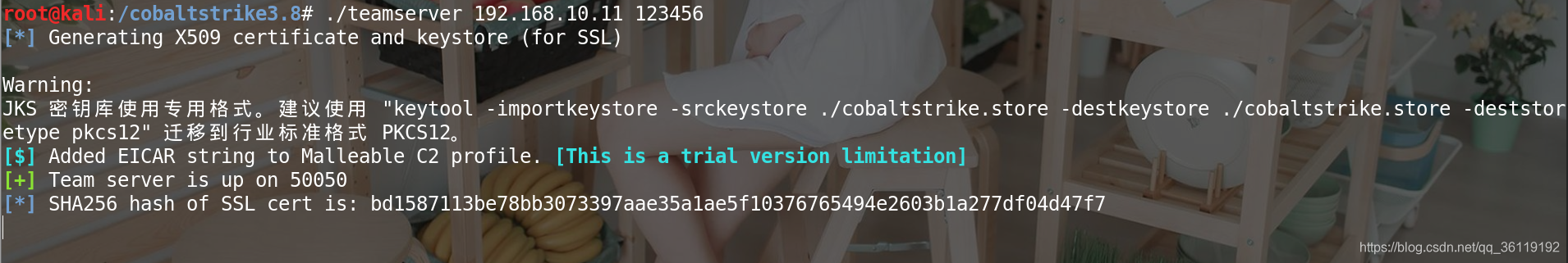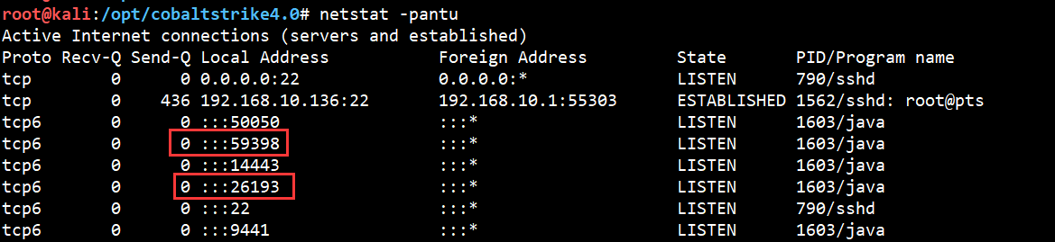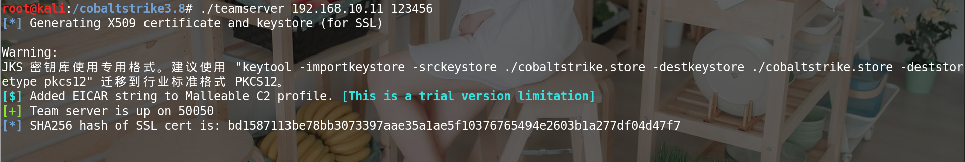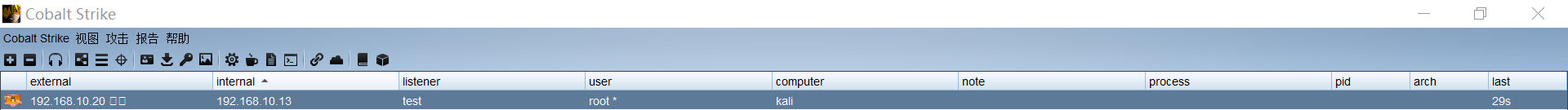 启动服务端: ./teamserver 192.168.10.11 123456 #192.168.10.11是kali的ip地址,123456是密码