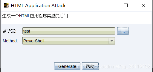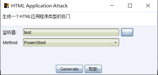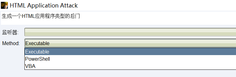 - HTML Application 生成一个恶意HTML Application木马,后缀格式为 .hta。通过HTML调用其他语言的应用组件进行攻击,提供了 可执行文件、PowerShell、VBA三种方法。