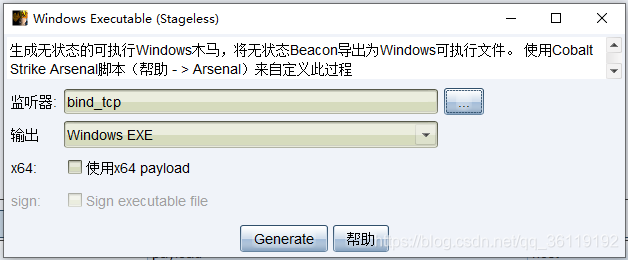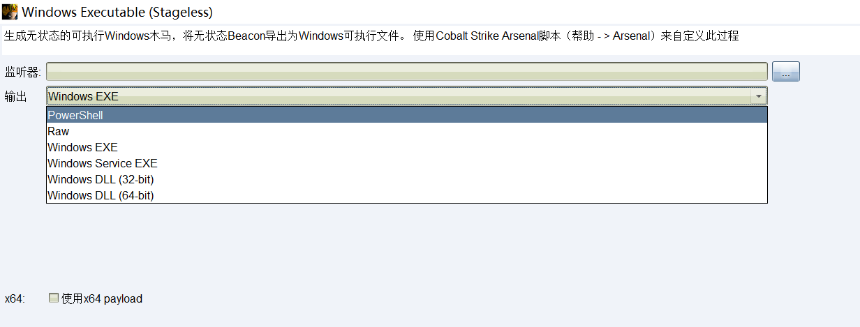 - Windows Executable(S) 用于生成一个exe可执行文件,其中包含Beacon的完整payload,不需要阶段性的请求。与Windows Executable模块相比,该模块额外提供了代理设置,以便在较为苛刻的环境中进行渗透测试。该模块还支持powershell脚本,可用于将Stageless Payload注入内存