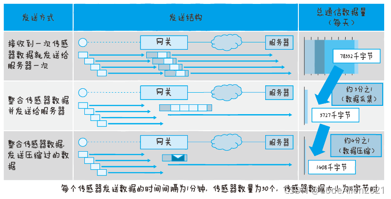 我们可以先把要从网关终端发送到中心服务器的那些传感器数据暂时积累在网关终端上,再把这些数据一并压缩,从而削减通信量。尤其是在连接到网关终端的设备数量较多,或是传感器终端发送数据的时间间隔较短的情况下,要采集的数据量会增多,比起接收一次数据就发送给服务器一次来说,采用压缩数据的方法更能大幅度地削减发送的数据量。