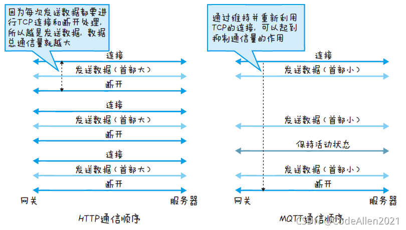 比如我们来比较之前讲过的HTTP 和MQTT,HTTP 协议的首部(header)比较大,而且每次发送数据都要发送一个数据包来连接/断开TCP,因此发送的数据越多,数据总通信量也就越大。而MQTT 的首部比较小,还能在维持TCP 连接的同时,进行下一次数据的收发,所以比起HTTP,它更能抑制数据总通信量。