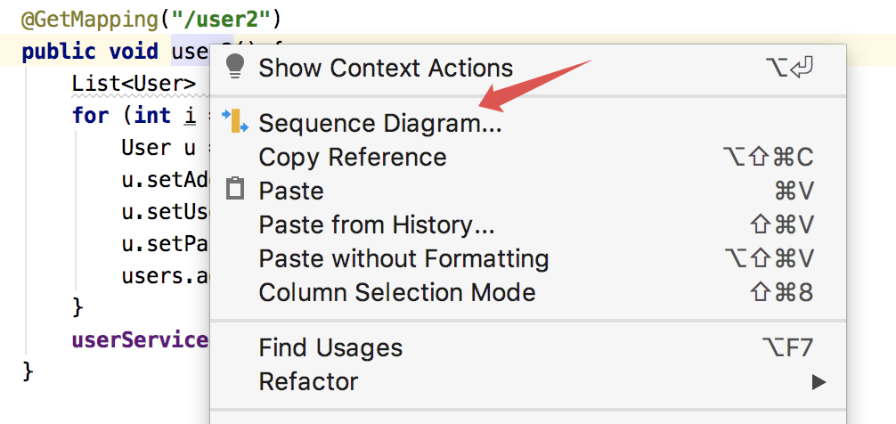 - 在 IntentionAction 提示中 Generate sequence diagram(光标放在方法名上,按 alt+enter 或者 option+enter):