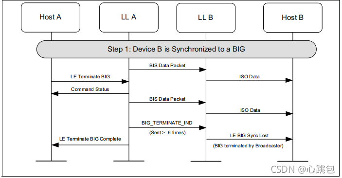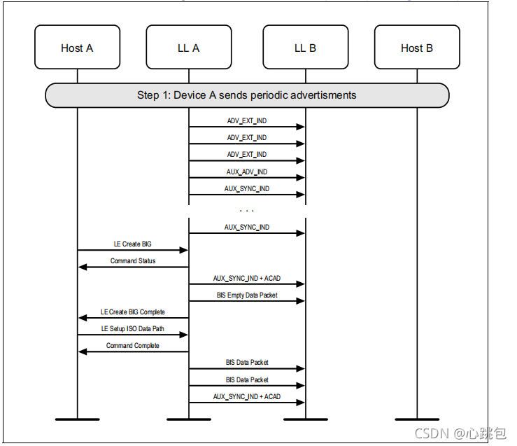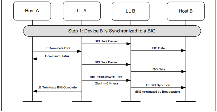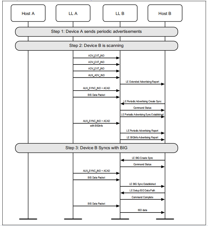 设备进入同步广播状态,并启用与BIG相关联的定期广告。然后,该设备创建BIG,并使用等时数据路径发送等时数据