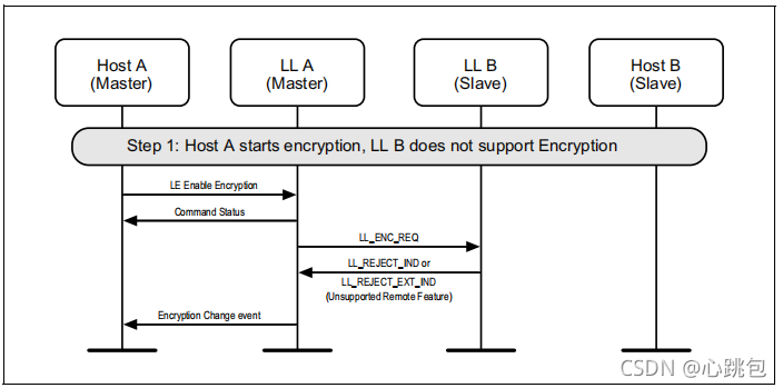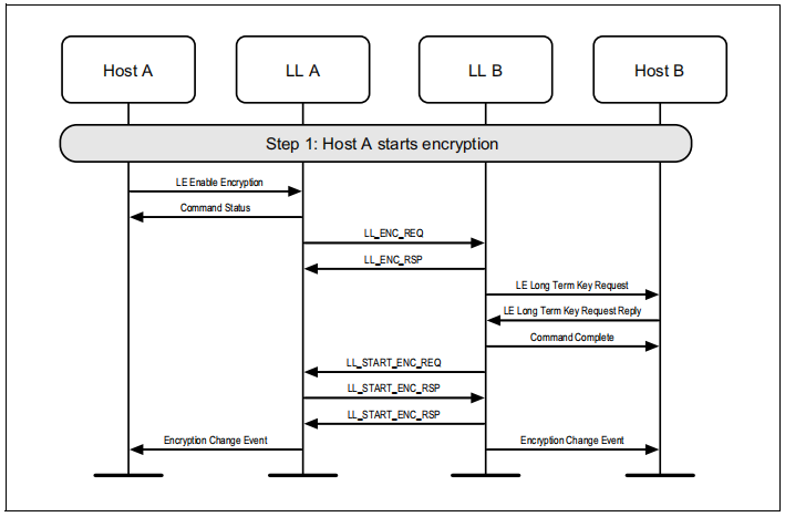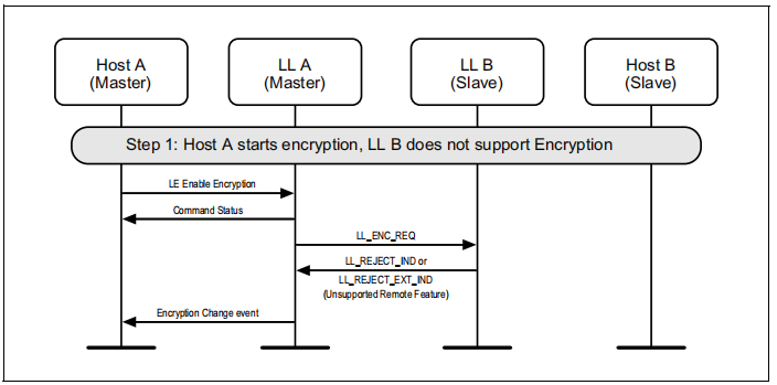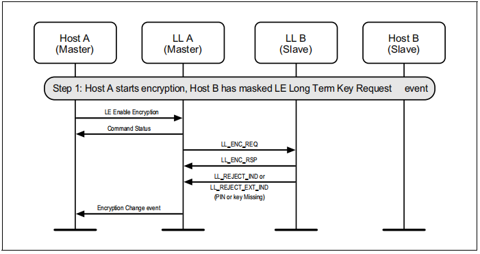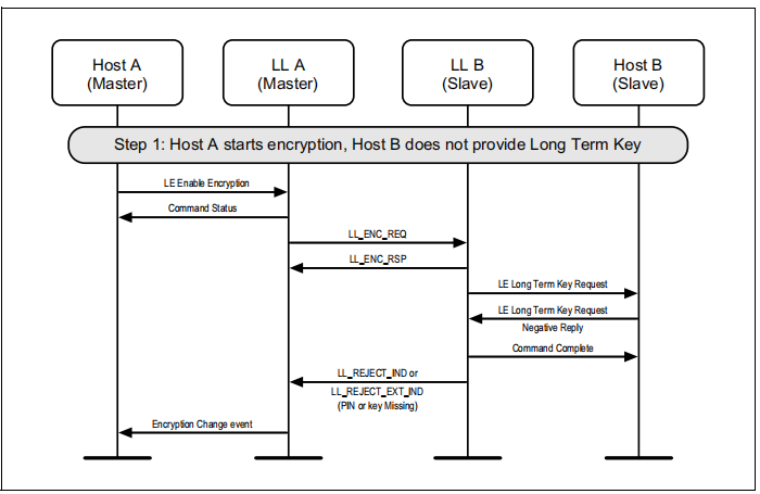 如果尚未在连接上启动加密,则可能会由主节点启动加密。图6.10显示了从程序屏蔽了HCI_LE_Long_Term_Key_Request事件时的故障情况。