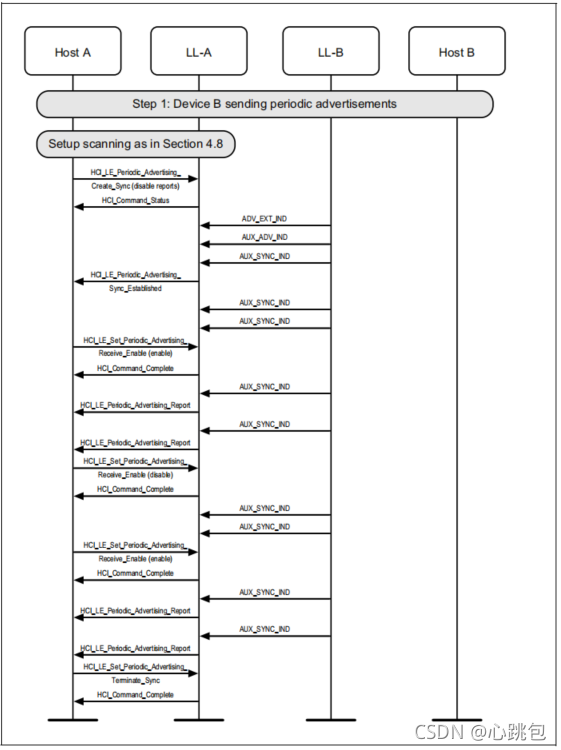 扫描设备(A)将定期广告同步信息传输到设备C,设备C开始收听定期广告列车,但只在明确要求时才向主机发送报告。