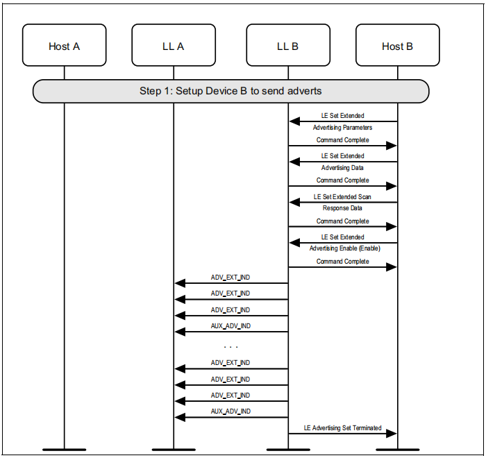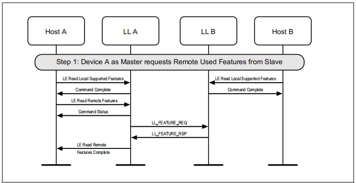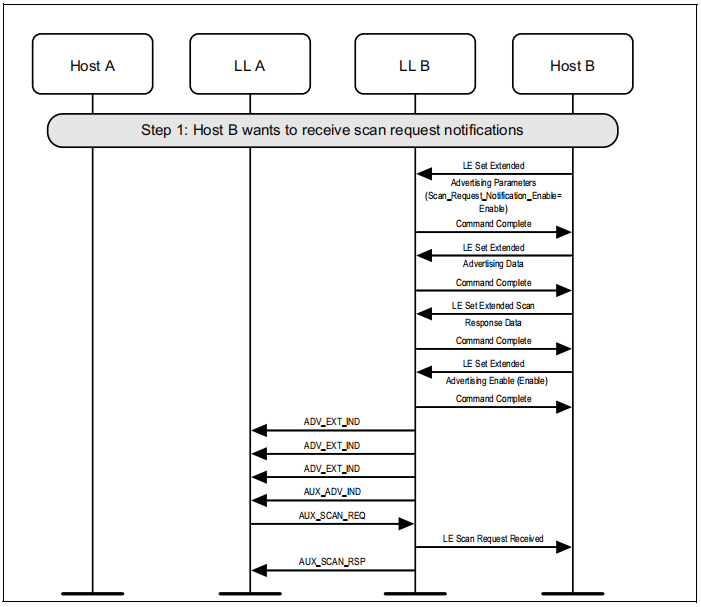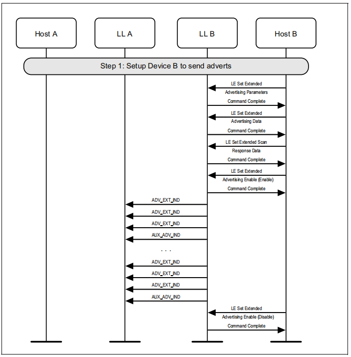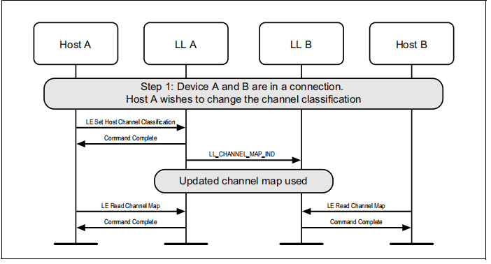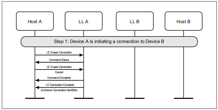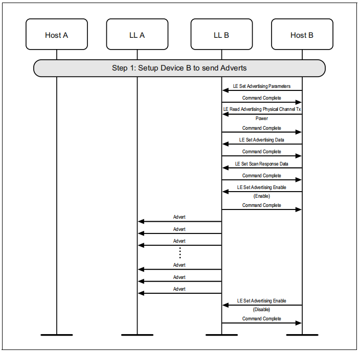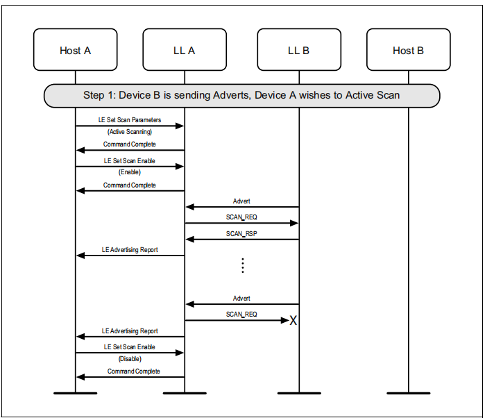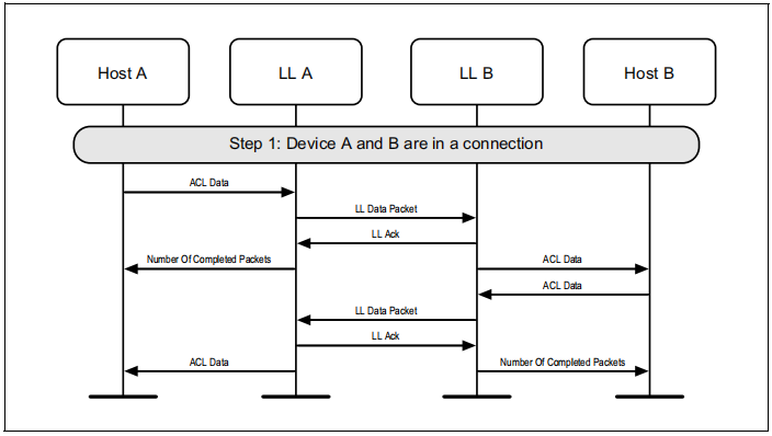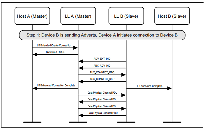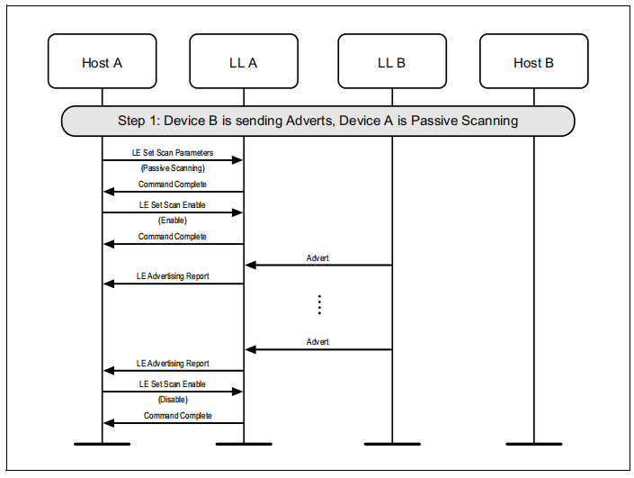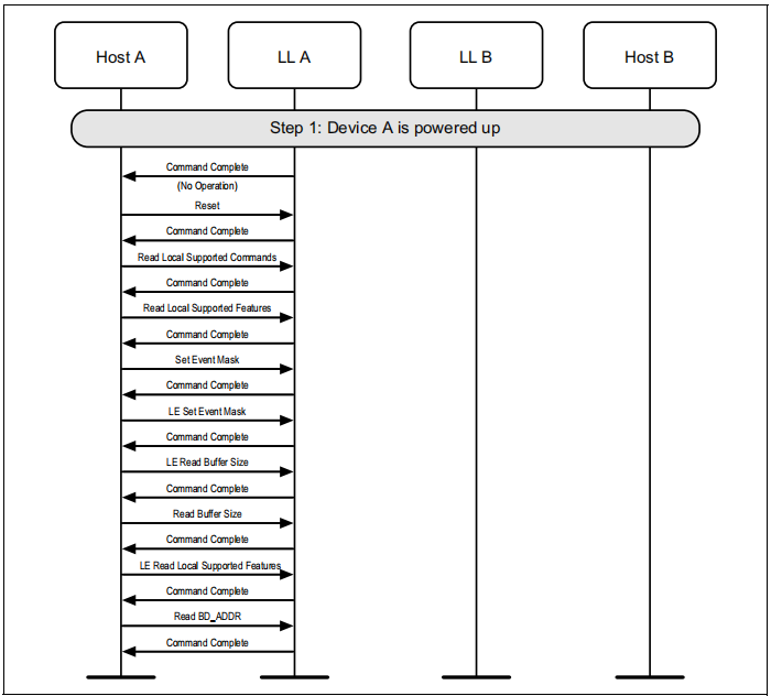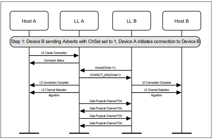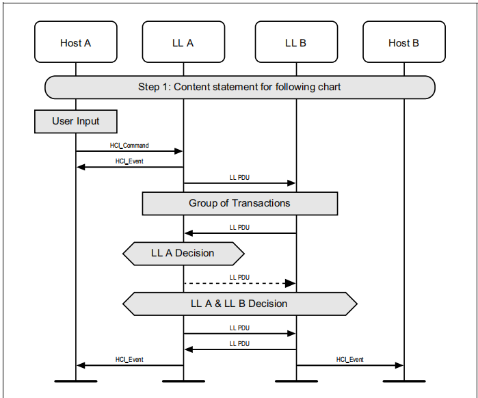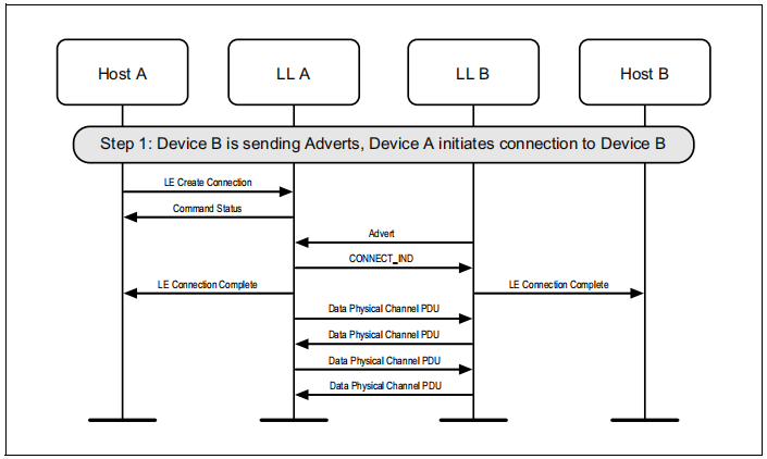 图1.1所示的示例中表示的协议实体说明了两个名为A和B的设备之间的交互。请注意,在本例中,每个设备都包括一个主机和一个LL实体。本节中的其他MSCs可以显示两个以上设备的相互作用。