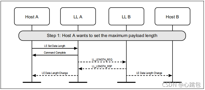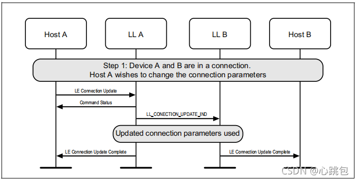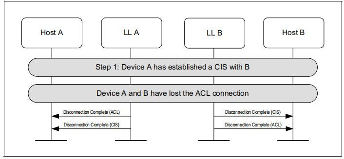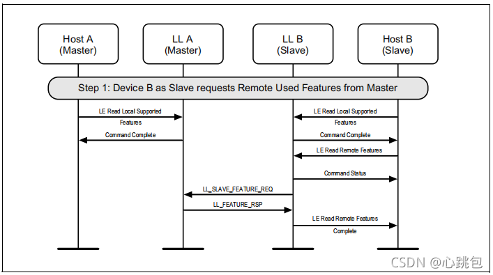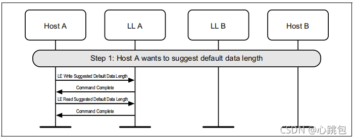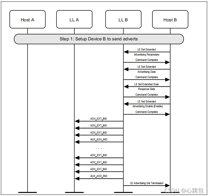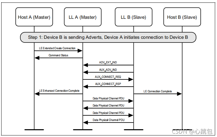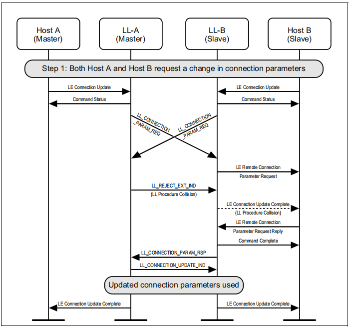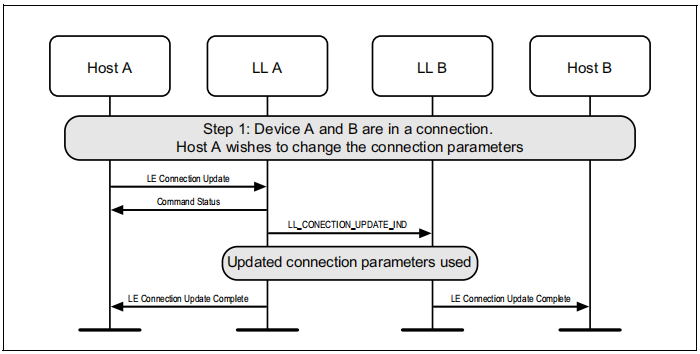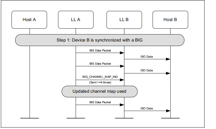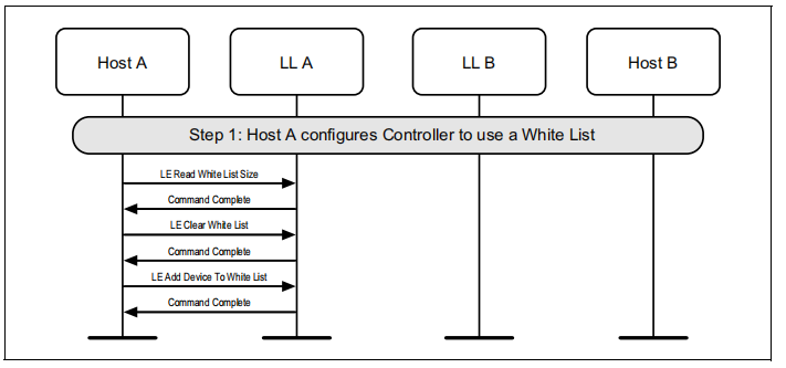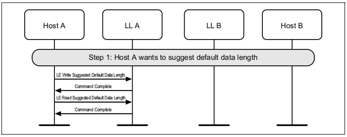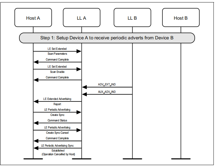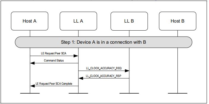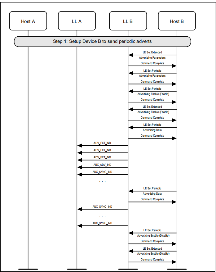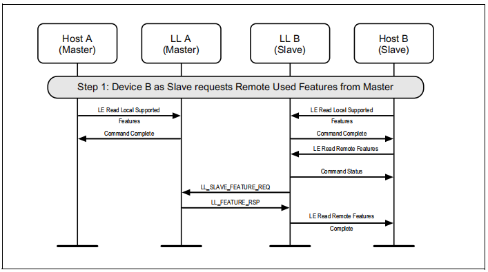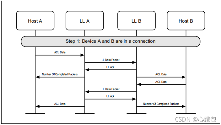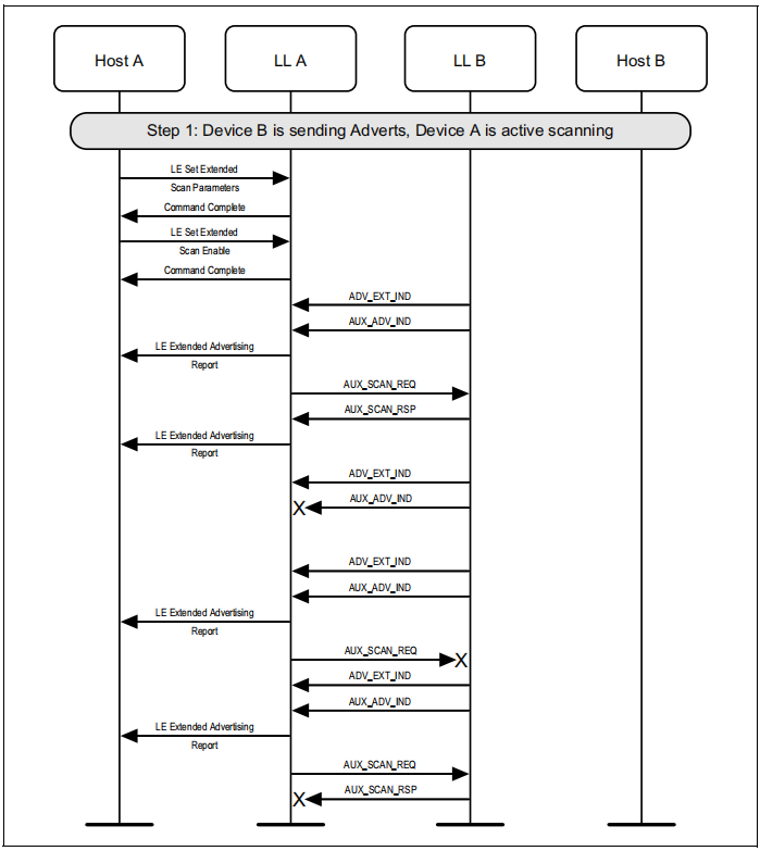 图1.1所示的示例中表示的协议实体说明了两个名为A和B的设备之间的交互。请注意,在本例中,每个设备都包括一个主机和一个LL实体。本节中的其他MSCs可以显示两个以上设备的相互作用。